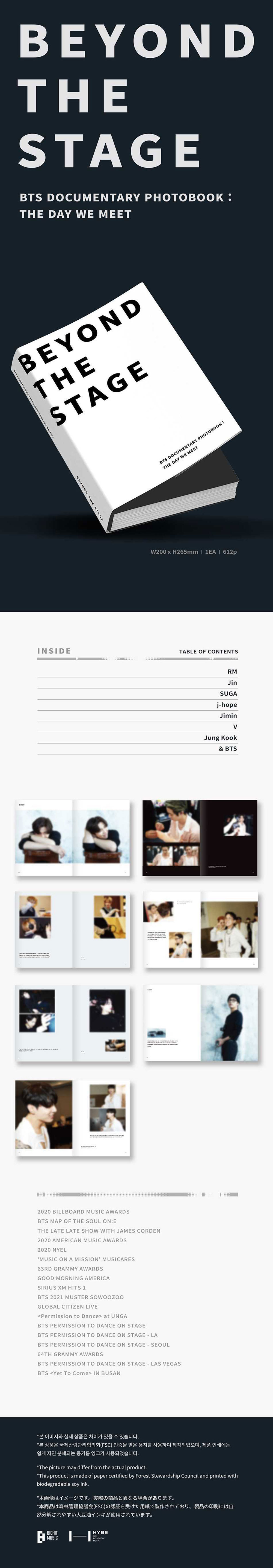 잠시 멈춘 시간 동안 방탄소년단 멤버들이 들려준 무대에 대한 감흥, 아미와 팀을 향한 애정, 그리고 ‘나’에 대한 진솔한 발견을 담은 ‘BEYOND THE STAGE’ BTS DOCUMENTARY PHOTOBOOK : THE DAY WE MEET은 12월 15일 예약판매 시작 후 12월 22일 정식 출시 예정입니다.