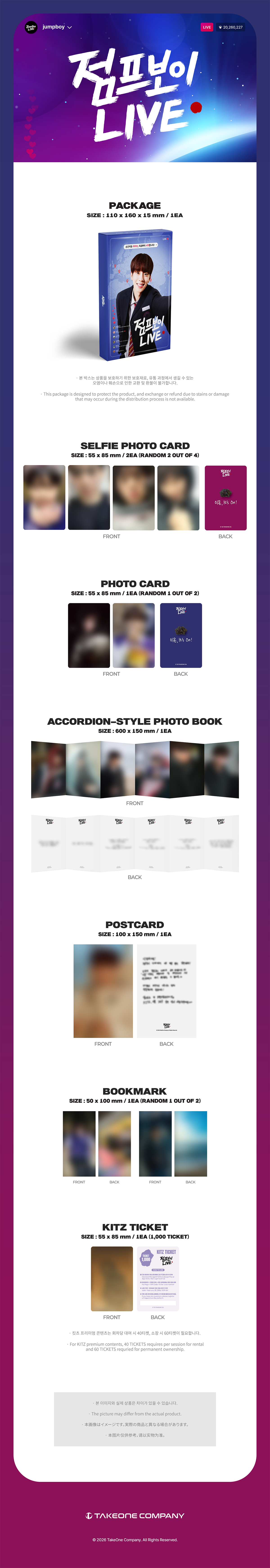In <JUMP BOY LIVE> KITZ KIT, you can get various unreleased photo cards from <JUMP BOY LIVE> starring VERIVERY KANGMIN, an accordion-style photo book & post card featuring handwritten messages, a bookmark and even a KITZ TICKET at once!